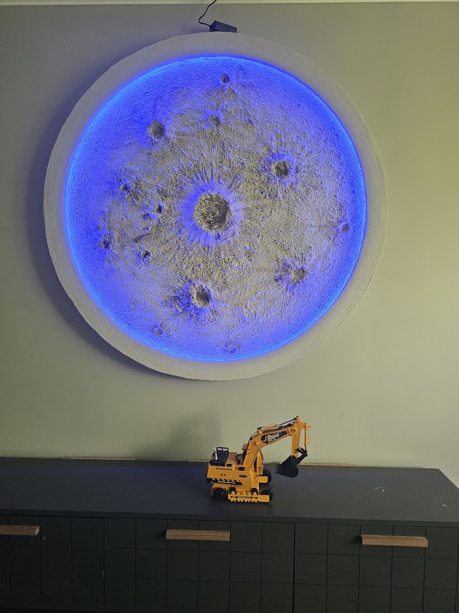 Esimene suurem projekt. Kuu, mis annab poiste toas ääsel valgust ja päeval sisustuselement. Kuu põhja valmistamiseks on kasutatud OSB plaati, ääred kipsiga ja viimistlus Uniflot kipsseguga. Värvi andis kuule erinevate toonide segamine. Sisemisele äärele paigaldatud LED valgustusega saab anda kuule erineva tooni. Taolise kuu läbimõõt on umbes 128cm.