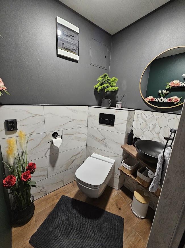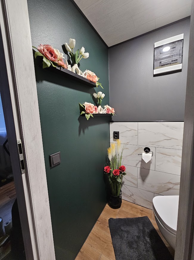Juurdeehituse käigus sai maja teisele korrusele ehitatud wc. Meie vuukisime, pahteldasime, värvisime ja teostasime ka sisekujunduse. Plaatimise teostas omanik ise.